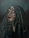 Artwork description: I have always loved the symbol and purity of Virgin Mary. I remember visiting Europe for the first time many years ago and walking into several churches seeing different depictions of her, all which were very beautiful and emotionally-charged. I wanted to create my own modern version of Mary using symbols throughout art history of her dressed in red and with a gold halo over her head.